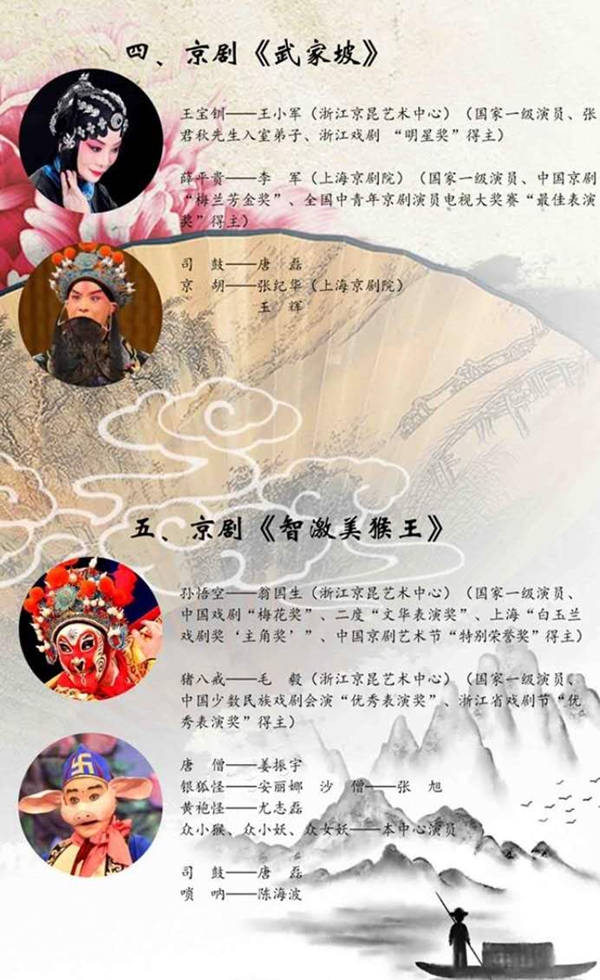 6月12日晚演出的第二台专场是“浙、京、沪、鲁”四地京剧名家联袂献演的经典京剧专场,演出剧目也是有文有武,唱做俱佳,演出阵容非常华丽。由来自国家京剧院、上海京剧院和浙江京昆艺术中心(京剧团)的中国戏剧“梅花奖”、“文华表演奖”、上海“白玉兰戏剧奖‘主角奖’”、中国京剧“梅兰芳金奖”得主李军、唐元才、翁国生、田磊等京剧名家领衔主演;浙京著名张派青衣王小军、山东青岛京剧院副院长、优秀武生巩发艺、浙京优秀中青年演员毛毅、王文俊、应钧、尤志磊等联袂主演。演出的剧目是这些京剧名家的五出代表作品《八大锤》、《秦琼观阵》、《探皇陵》、《武家坡》、《智激美猴王》。司鼓和京胡由浙江京昆艺术中心(京剧团)的唐磊、李一玲、王辉、张智民和上海、青岛等京剧院的张纪华、赵成共同担纲演奏。