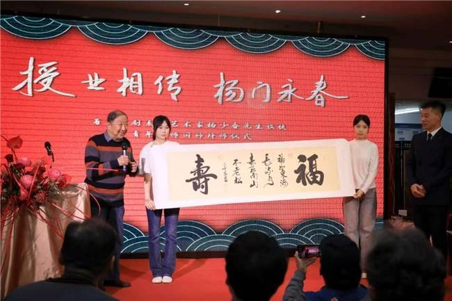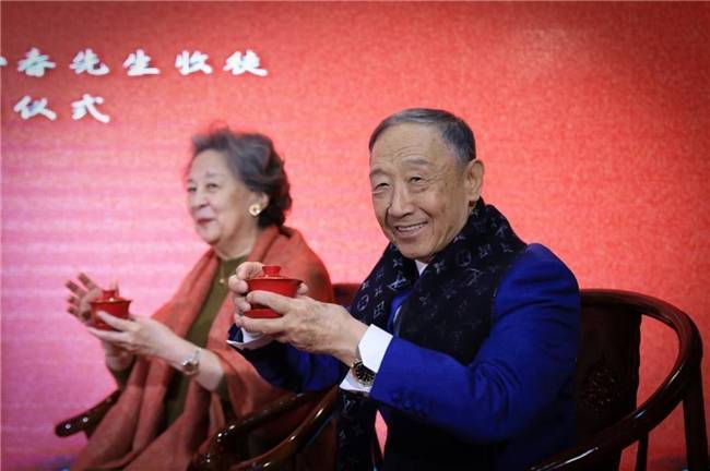 在全场嘉宾的见证下,闫帅庄重行叩拜大礼,向杨少春先生及师娘李玮女士依次献上鲜花、敬上清茶。一束鲜花承载赤诚敬意,一杯清茶缔结师徒情缘,整套传统拜师礼节庄重典雅,尽显“师徒同心、一脉相承”的深厚情谊,感染了在场每一位来宾。