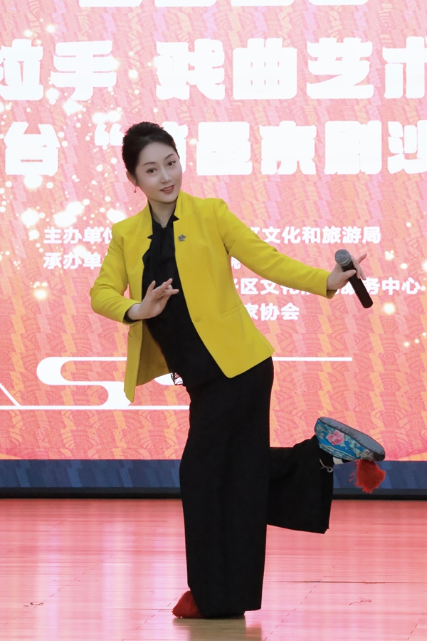 张淑景的粉丝们知晓她是武旦、刀马旦名家,她的《盗库银》、《盗仙草》、《八仙过海》、《虹桥赠珠》、《挡马》等剧目,深受戏迷追捧。由她来主讲京剧旦角儿是十分贴切的,因为她表演的剧目中,有全本大戏《穆桂英》、《大英杰烈》,中型剧目《无底洞》,现代样板戏《智取威虎山》里的小常宝,《红灯记》中的李铁梅,更有我和不少戏迷未曾看到的《昭君出塞》、《小放牛》、《虹霓关》、《游龙戏凤》、《霸王别姬》、《三击掌》、《平贵别窑》等剧目。她还学习了昆曲剧目《游园》、《玉簪记》片段,由于种种原因,我未能看到她演出的这些剧目,但她的戏路宽广,不仅涉及到了花旦、花衫、青衣等行当,还涵盖到了王(王瑶卿)派、梅派、尚派、赵(燕侠)派,她曾向表演艺术家刘秀荣恩师学习了《大英杰烈》、《穆桂英》、《虹霓关》、《游龙戏凤》、《白蛇传》、《三击掌》、《平贵别窑》,向表演艺术家阎桂祥老师学习了“小乖乖”唱段,向教育家李喜鸿老师学习了《昭君出塞》、《双阳公主》,向表演艺术家李玉芙老师学习过《霸王别姬》等剧目,加上她从艺以来积累的丰富舞台经验、向众多老师虚心问艺所储备的深厚功底,又有一副好嗓子,在京剧舞台上塑造了众多令人喜爱的人物形象。我看得最多且印象极为深刻的,便是她在《白蛇传》中既演小青又演白娘子的精彩场。其中,“打出手”的表演更是独具魅力,每次演出均是掌声四起,叫好声不断。有戏迷说:武旦、刀马旦唱腔不多,重在武功表演。我回应道,的确如此,但是你若是听到她的小常宝,“八年前风雪夜大祸从天降”、“坚决要求上战场”,她演唱的李铁梅唱段,再听她饰演陈秀英乔装改扮后寻觅匡忠时的“娃娃调”,便能领略到张淑景在唱功上的甜美、靓丽、既高亢也抒情的演唱水准了。因此,聆听,观赏张淑景和她的同事连讲带表演,还有与观众亲切互动的情节,对于京剧票友和观众是十分喜欢的。这对爱好者来说,近距离的接触京剧名角儿,欣赏演员对京剧身段、脚步等常识的普及与讲解,实在是获益良多,这是在剧场观剧时难以体验到的独特场景。票友们唱戏都想唱好,但是,戏曲艺术很特别,需要口传心授,仅跟着“录老师”学习,是不可能达到专业的水准的。京剧的演员们以“一个枣、两个枣、三个枣”、“咦”、“啊”,来指导发声,以“皱”、“展”来指导面部表情,并指导大家如何在舞台上展示,“舒眉展眼”,尽管是表演上初级常识,也使票友们受益匪浅。张淑景和她的同事在“手眼身法步”之上的表演,在发声、唱腔上的示范,无疑能让爱好者们在演唱和表演、身段上更上一层楼。