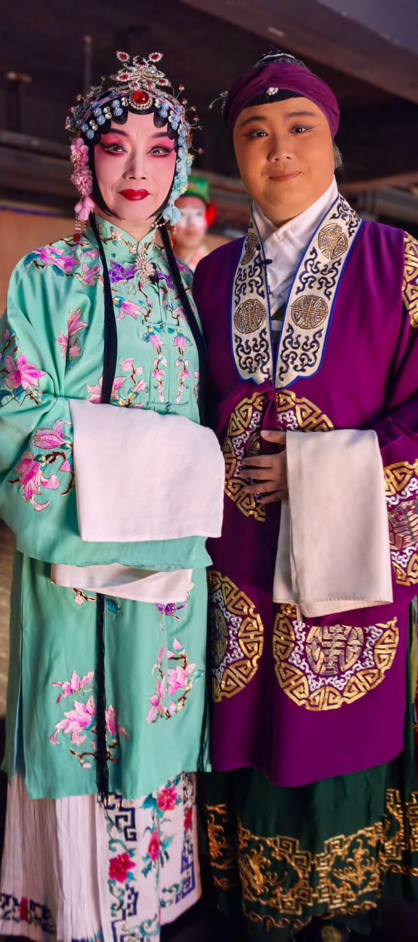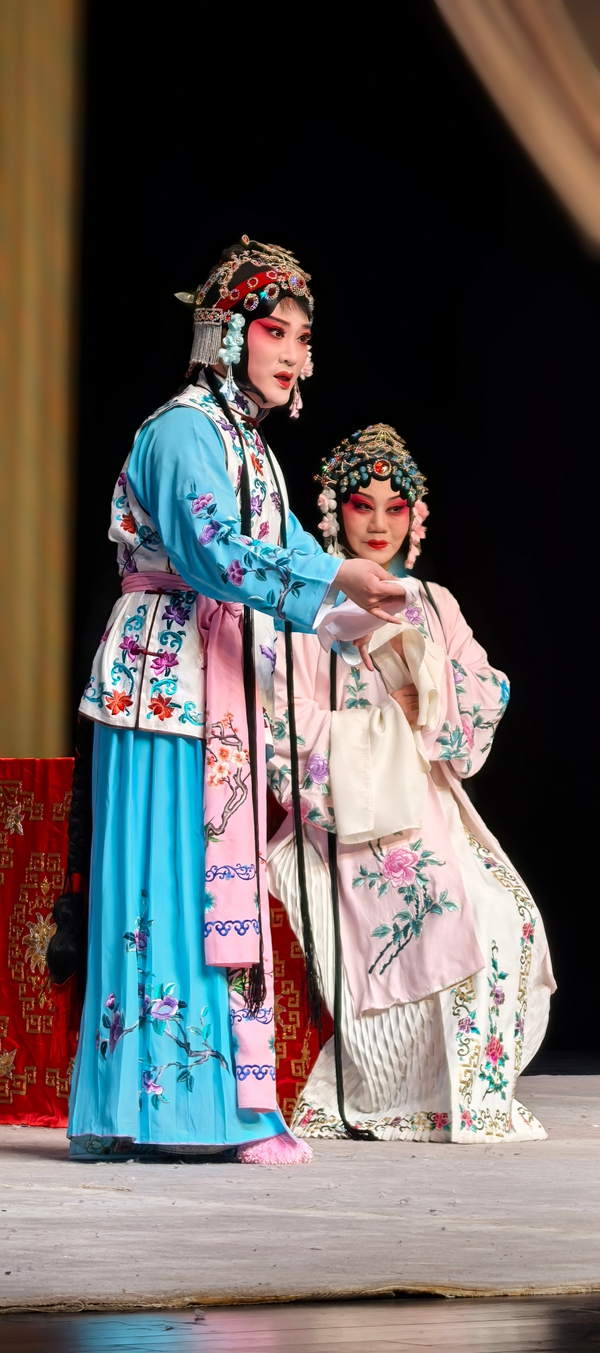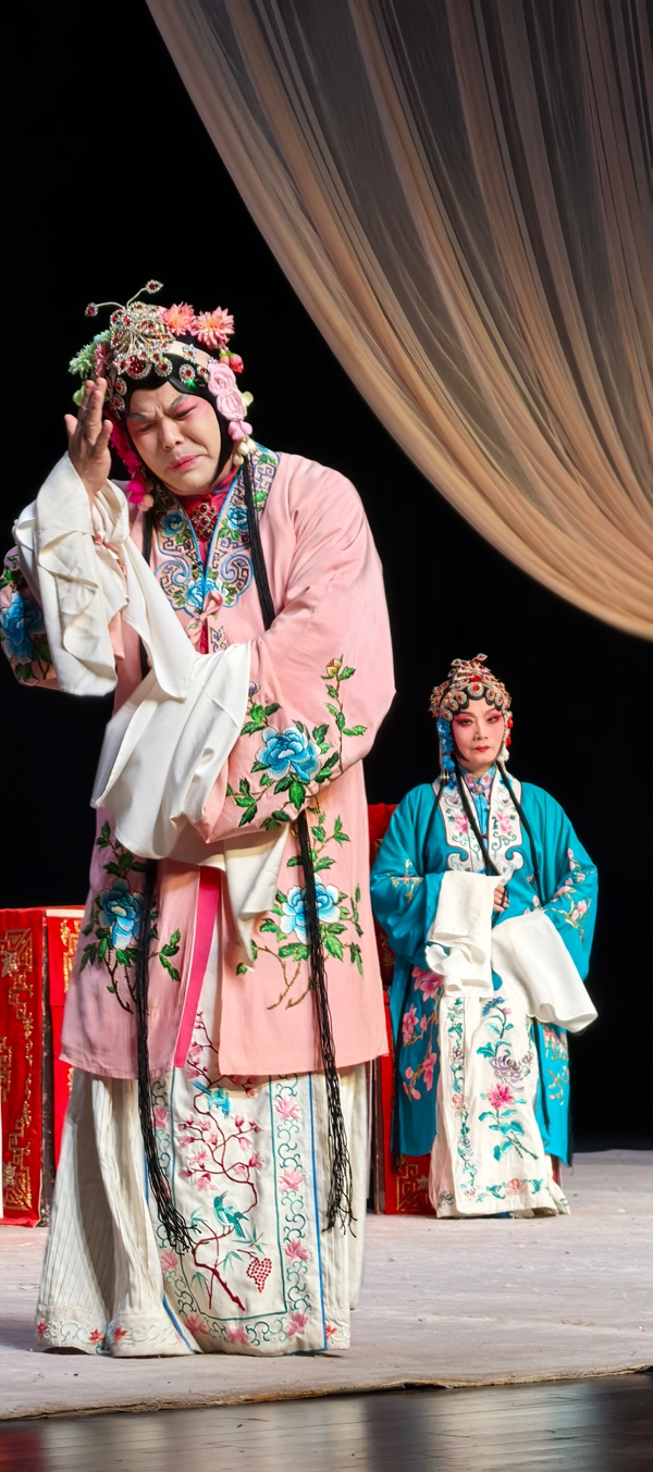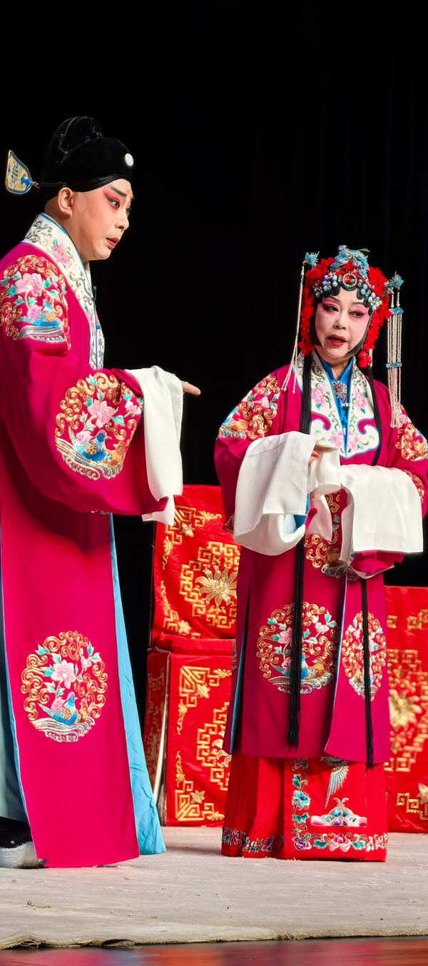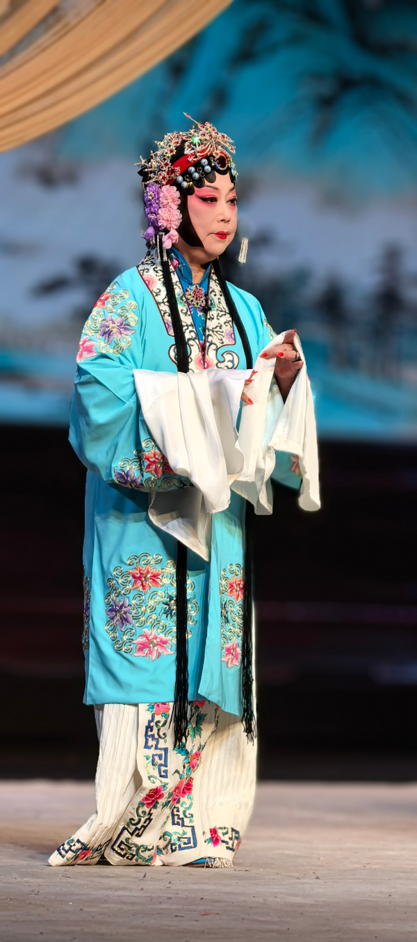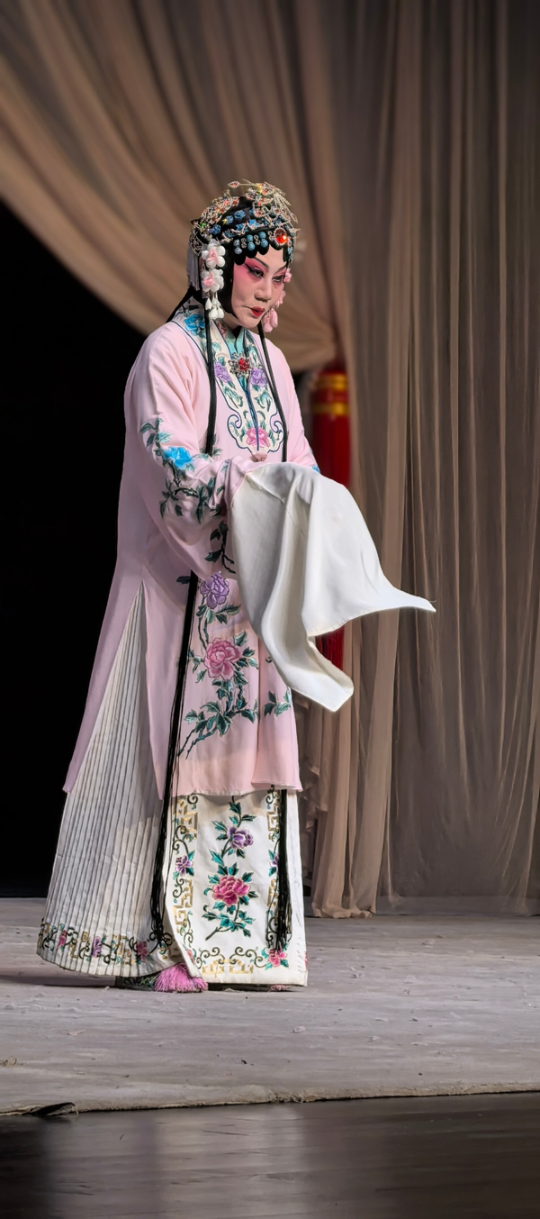 《凤还巢》是梅派的经典名剧,讲述了程家二女雪娥与雪雁的婚姻故事。蒋会长告诉记者,自2022年她接任会长以来,已相继在全国举办了6场“纪梅”活动的循环演出,尤其是马年初六下午在开明大戏院举行的“芳华迎春2026全国京剧票友新春演唱会”的一场演出(我也去观看的),得到了前辈艺术家和戏迷朋友的高度赞誉,为今天的全本戏公演奠定了基础。傍晚化妆时,蒋会长告诉记者,今天剧院楼上楼下全满,许多票友一大早就送来了祝贺花蓝,开演前半小时,戏迷们成群结伴来到开明大戏院,对今晚的演出提前进行热场,苏州的戏迷真的很执着。