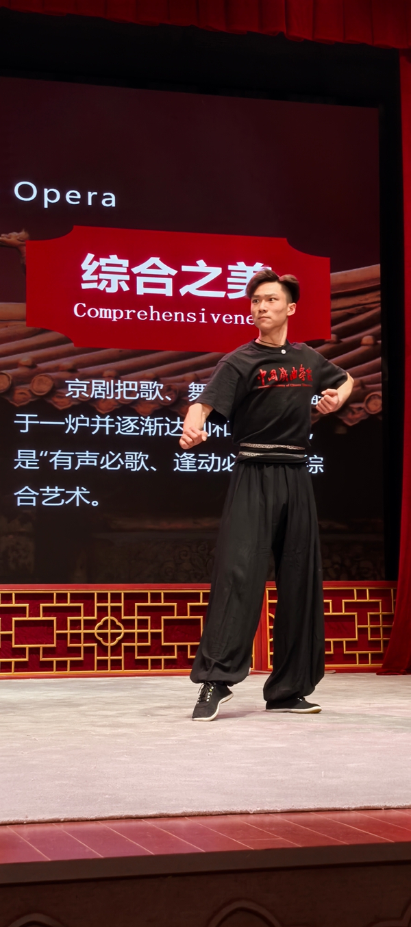 公开课邀请中国戏曲学院京昆系优秀青年教师郑轶担任主讲。专业院校学生现场展示了唱腔、身段、表演、把子功等戏曲基本功。郑轶分解兰花指、水袖、脚步等动作要领,并指导观众体验花枪技巧。多位观众受邀上台,在老师指导下学习身段,完成基本动作。