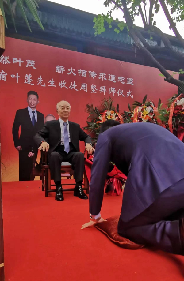 值得称道的是,周仲博老先生已届98岁高龄,依然身体硬朗、头脑清楚。此次周坚拜在叶蓬教授门下,即是周仲博先生首肯与倡导的。在仪式现场,周老还专门发来祝贺视频,勉励孙儿认真向师父求教,并热情洋溢地向与会嘉宾表达谢意。