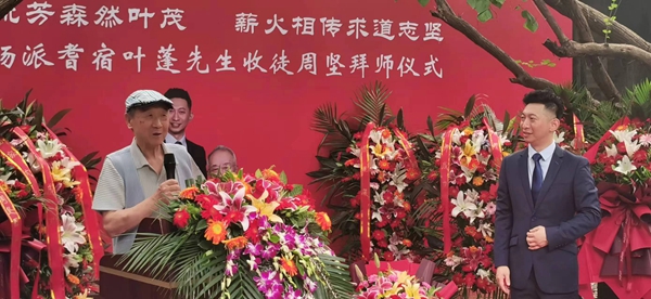 此次收徒拜师活动以“杨韵流芳森然叶茂·薪火相传求道志坚”为主题,采用了“三叩首、献花、敬茶”等传统的礼仪流程。行礼之后,师徒二人分别发表感言。叶蓬教授首先回顾了叶氏家族与“周家班”几代世交的渊源,以及自己与周仲博先生的特殊感情。接着充分肯定了新徒周坚的学习态度和艺术成就,并对其提出了“继续努力、矢志传承、扎根基层”三个殷切期望。周坚则深情地表示,在恩师广播桃李的不懈努力下,杨派艺术达到前所未有的喜人局面。前人耕耘,福泽后辈。自己定将谨遵教诲,在杨派艺术广袤的青森中茁壮成长。