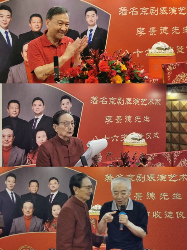 赵景勃教授讲话中先用生动的细节、事例回忆了景德、景春兄弟二位在中国戏校的勤奋;七十年代,景德老师回到学校牵头做了许多工作,比如“京舞体”相结合的训练、教学探索,研究了运动力学、损伤学,提高素质训练,对学生的健康发育加以科学的保护,使得传统的训练有了现代化的提升;除了舞台演出之外,他在现代戏编创、教学剧目设计方面,创作思维和艺术视野很开阔;他称赞景德先生为人传统、低调,也夸奖几位弟子心系师恩,并祝景德先生夫妇传艺不止,弟子技艺大涨。