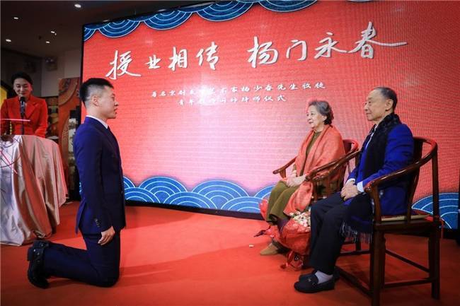 在全场嘉宾的见证下,闫帅庄重行叩拜大礼,向杨少春先生及师娘李玮女士依次献上鲜花、敬上清茶。一束鲜花承载赤诚敬意,一杯清茶缔结师徒情缘,整套传统拜师礼节庄重典雅,尽显“师徒同心、一脉相承”的深厚情谊,感染了在场每一位来宾。